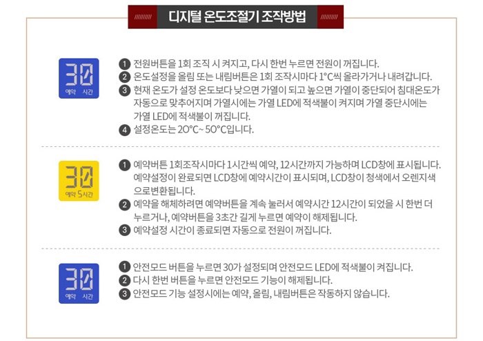 디지털 온도조절기를 조작하는 방법도 어른들이 사용하기에 하나도 어렵지 않고 2way방식으로 퀸스타일의 침대에세는 잠잘때 큰 어려움 없이 잘 수 있도록 안전까지 생각해서 만들었습니다. 안전모드만 켜두어도 사용하는데 어려움이 하나 없는 한울흙돌침대렌탈 모델입니다.