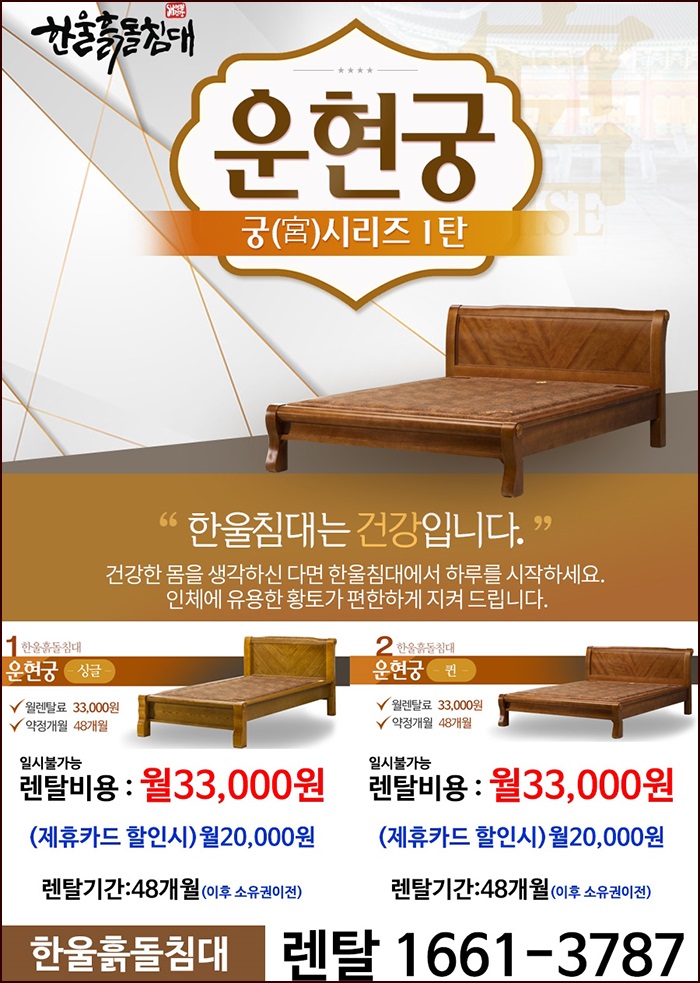 가장 가성비 좋고 가격 저렴한 운현궁모델입니다. 월33000원으로 4년동안 고장걱정없이 사용할 수 있습니다. 렌탈기간동안에는 as가 무료입니다. 사람들이 사용하는 침대의 종류를 황토가 들어간 흙침대 혹은 돌침대로 사용하는 경우가 많이 있습니다. 이유는 간단합니다. 렌탈기간동안에는 걱정을 크게 두지 않고 매월사용하는 비용만 지불하고 사용할 수 있다는 장점이 있습니다.