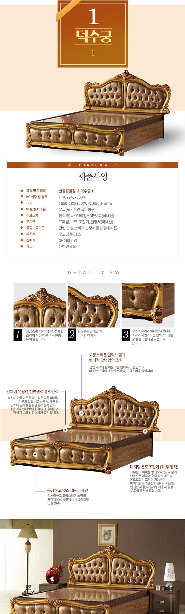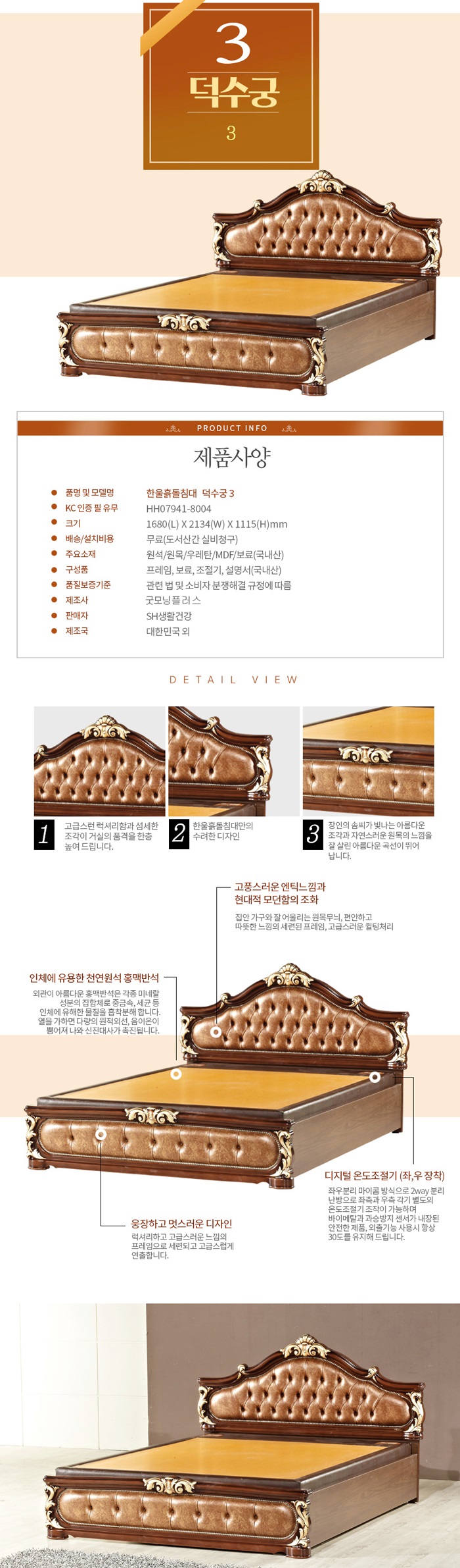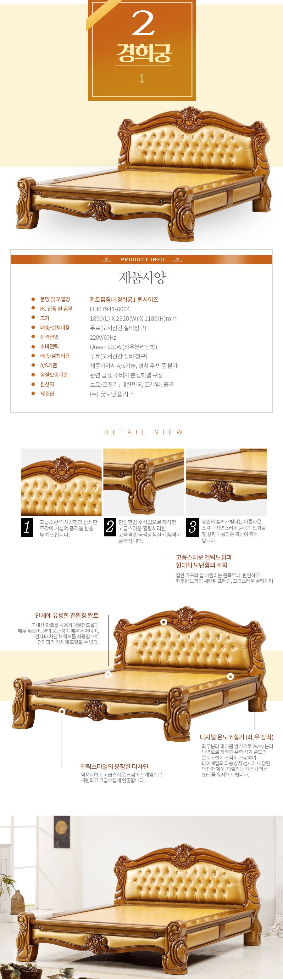 창덕둥모델입니다. 창덕궁1과 창덕궁2의 모델은 간단하게 쇼파 그리고 퀸모델만 있습니다. 모양 디자인이 고풍을 살린다고할까 그러면서도 디자인은 꽤 퀄리티를 높여주었습니다. 집에 혼자사는 부모님집에 들어가는 침대가 온도조절이 쉽고 사용하기 간편하고 고장걱정까지 없어야 한다는 점이 중요한 포인트라고 생각합니다.
