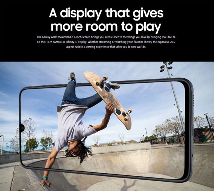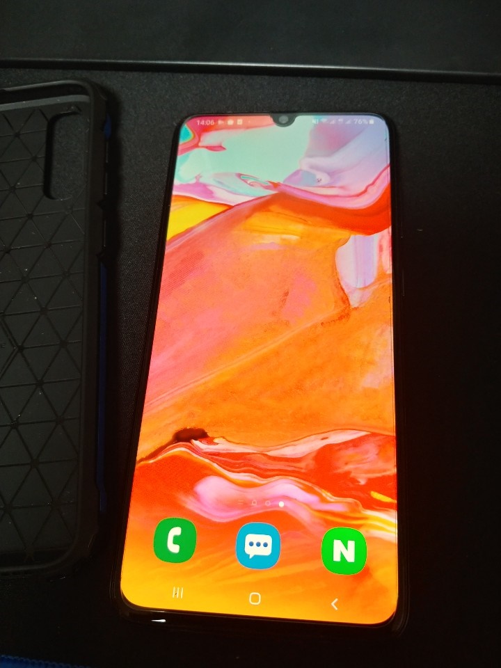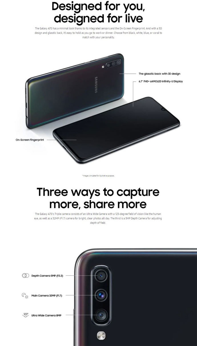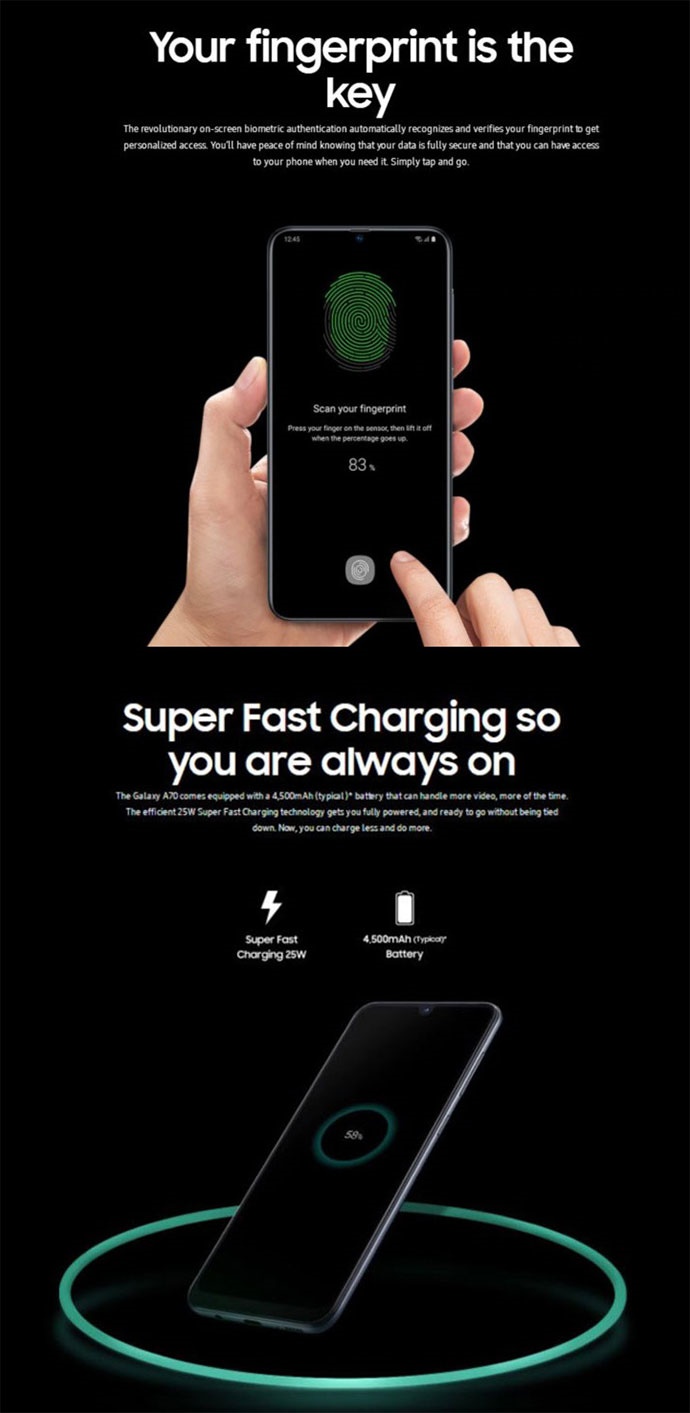 화면 사이즈 무게가 크고 대용량 배터리를 사용합니다. 4500mAh를 사용해서 상위급 제품에 밀리지 않고 지문인식 장치는 있지만 생각보다 잘되는지는 잘 모르겠습니다. 느립니다 살짝 머 ㅎ 저는 만족합니다. 블루투스 버전으로는 5.0을 사용합니다. 보편적인 c타입의 단자를 사용하는 보급형 a70핸드폰입니다.