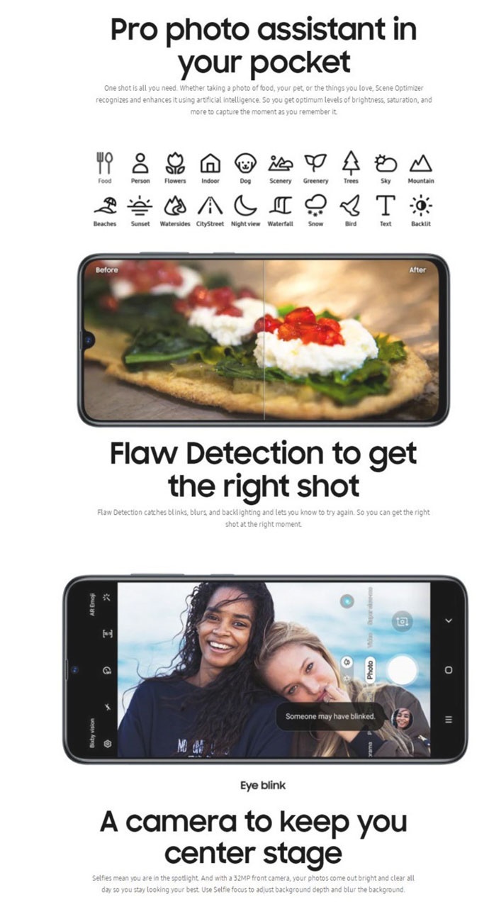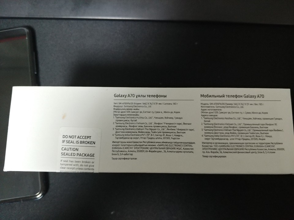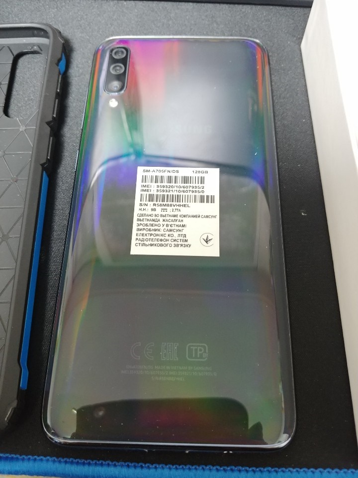 케이스 뒷면의 언어를 저는 못 읽겠습니다. 직구대신 직거래로 가지고 있는 분에게 싸게 구입했습니다 만족합니다. 스냅드래건을 사용하고 프리미엄급은 아니라서 먼가 완전 슈퍼스펙의 제품을 찾으면 아쉽지만 메모리 6gb에 128gb를 이용해서 용량 확보도 성공적인 a70제품입니다. 제일 좋은 부분은 듀얼 유심을 사용해서 전화도 2개 문자도 2개 등 사용할 수 있습니다. 카메라 스펙도 좋아서 카메라를 3개나 넣었습니다. 훌륭합니다. 보급형 폰으로 3200만의 화소를 보여주는 핸드폰 a70모델 40만 원 이하로 살 수 있는 보급형 듀얼 유심까지 사용하면 성공적인 만족스러운 스펙의 제품을 만날 수 있다고 생각합니다.. 다만 역수입해야 합니다. as는 걱정하지 마세요~