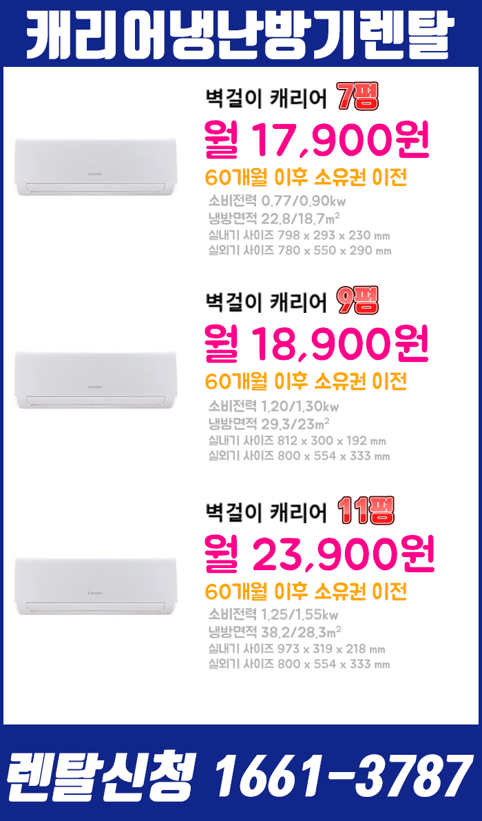 벽걸이 캐리어는 7평, 9평, 11평형 짜리가 있구요